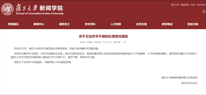 2024年12月,复旦大学校学术规范委员会收到举报,反映王灿涉嫌学术违规问题。